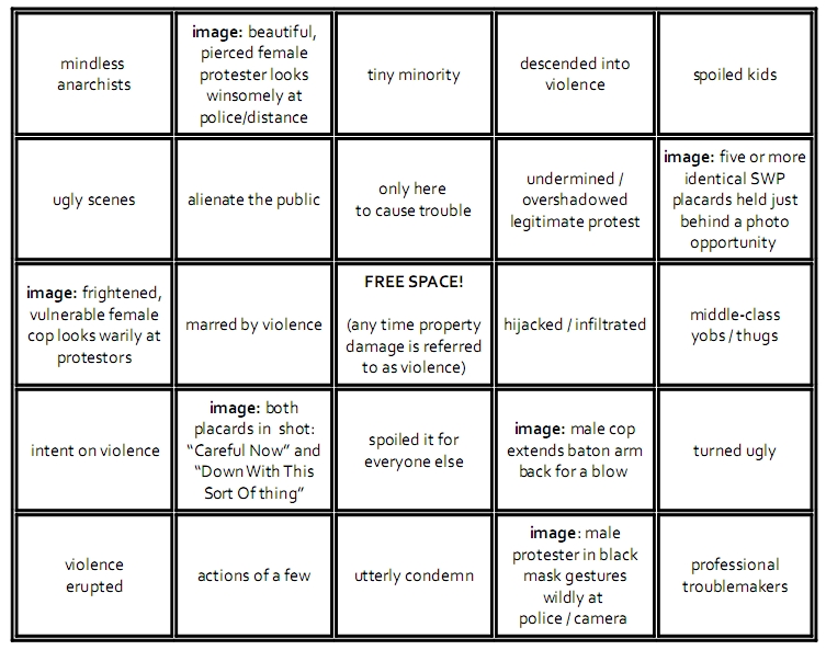 Protest Violence Cliché Bingo by Harry Giles is licensed under a Creative Commons Attribution-NonCommercial-ShareAlike 3.0 Unported License.