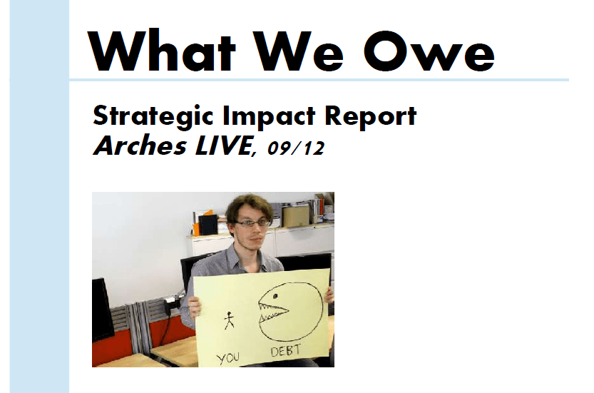 This is something I’ve explored before, as with the Steal This Production Report in 2010. And I’m always engaged with blogging development processes and results, as you’ll find often on this site. But I’ve never gone quite as far as the What We Owe: Strategic Impact Report, available to download below, with a comprehensive analysis of the finanial, environmental and social impacts of my Arches LIVE one-on-one:
