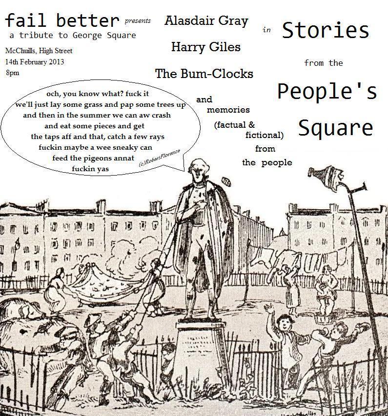 That’s right, it’s a night to celebrate George Square and what it represents as a public place of protest: through film, song, story, and poem. Fail better brings you a night of music, art and words about why and how George Square belongs to the people of Glasgow.