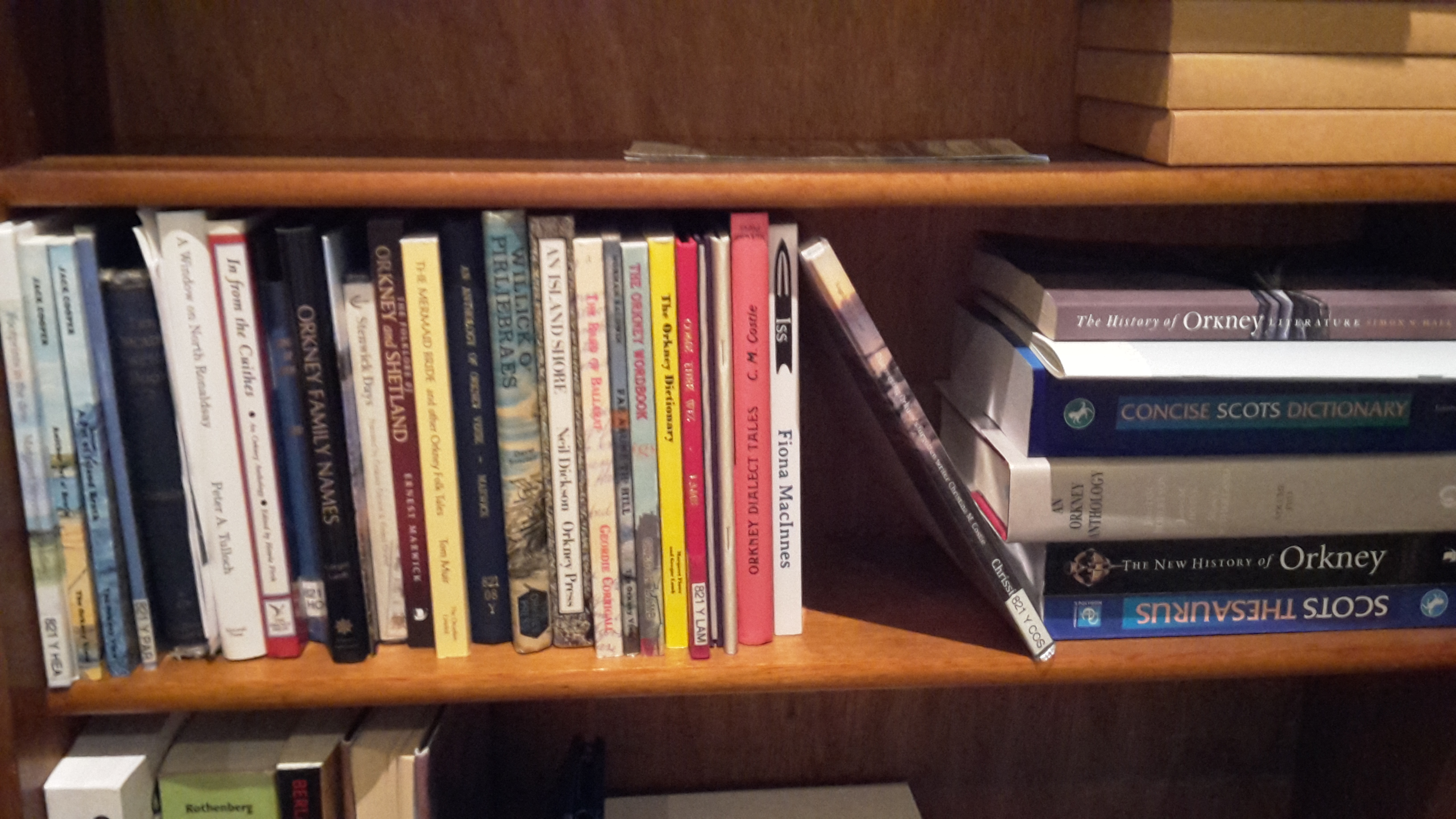 Orkney haes a grand writan and publeeshan culture. The Orcadian Bookshop‘s shelves are haevan wi Orkney beuks – local history, memoirs, novels, poetry, bairns’ beuks, photography, archaeology an a haep mair – an the Orkney Room at the Archive is fill o inspiration. Thare’s plenty o fock writan fae here an aboot here. Bit hid’s remerkable tae me at so little o hid, past an present, is wrote in the local language, especially whan the clossest comparator, Shetland, haes that rich a Shetlandic literatur, led bi Shetland ForWirds an the New Shetlander. Hou that is will hae tae bide fer anither time, bit A’d walcome yir thowts.