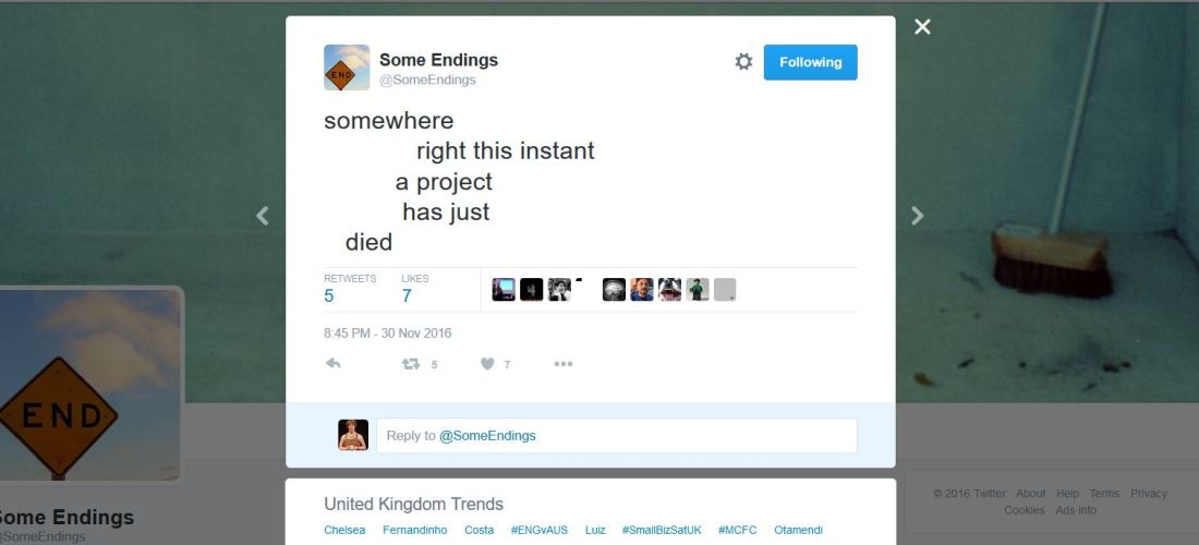 A simple meditation on death and endings: it’s a very macabre bot! I was struggling with the idea of how to end the project, and had all sorts of grand thoughts: in the end, I was very tired, and made a simple substitution poem in CBDQ, and that felt like the most appropriate way to finish.