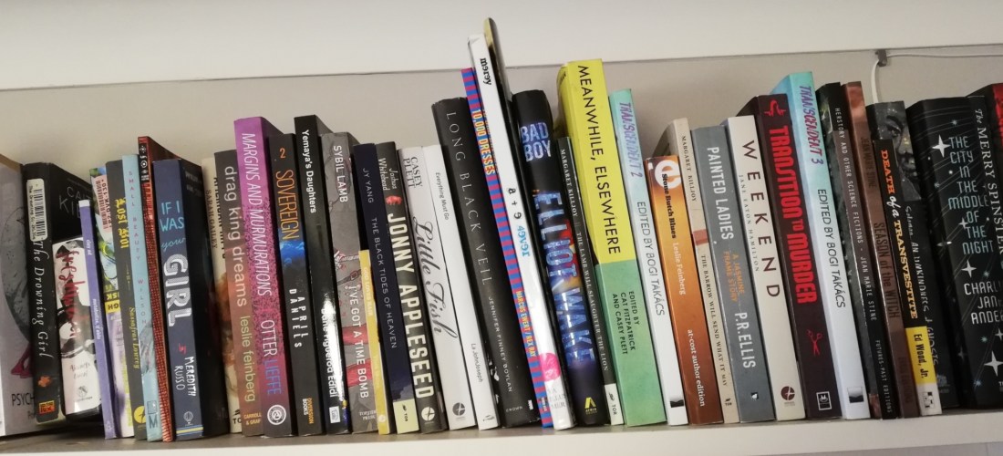 Similarly, I haven’t done a diversity tally on this, but I do know that well over half of what I’ve read has been written by trans people. I’ve now read the majority of novels about trans characters by trans authors ever published, and almost all of the trans poetry published in the UK and Ireland. Happily, trans writers keep writing, so I won’t stop. This has been a very healing reading project for me, something I’ve found myself and a world through. I can’t recommend it enough to other trans folk (or anyone). If you want to borrow any of these books, send me a message. Rachel Pollack in particular has been my companion throughout the year: a hugely influential but criminally underread author. Read her!