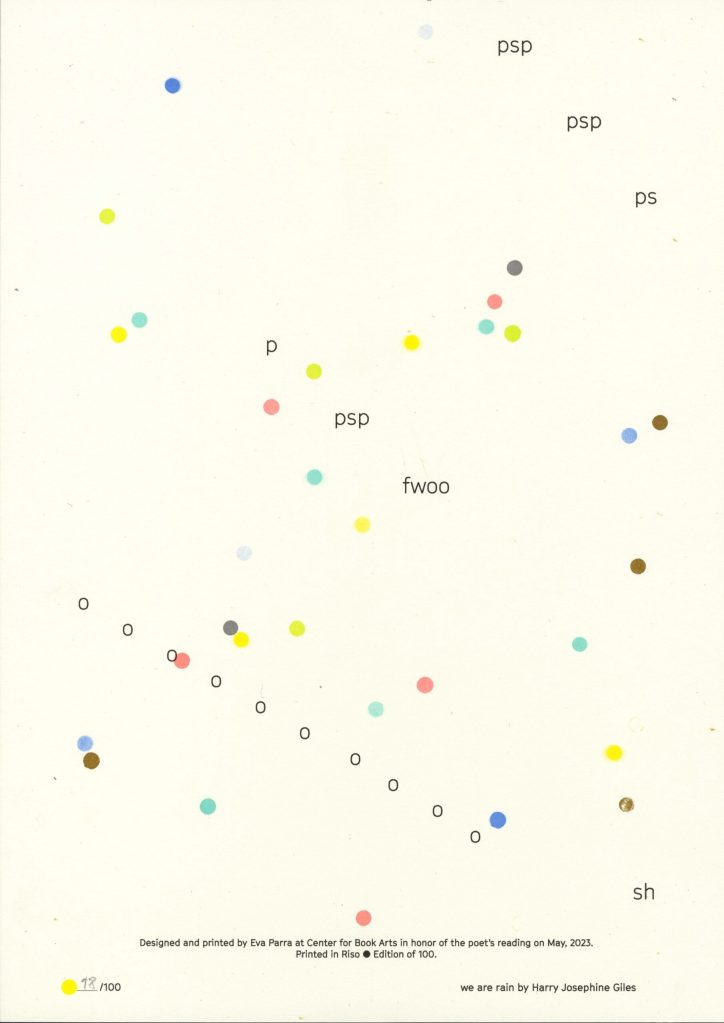 We Are Rain Poetry We Are Rain is a poetry risograph print made in collaboration with the artist Eva Parra for the Center for Book Arts. Share this: Click to share on Facebook (Opens in new window) Facebook Click to share on X (Opens in new window) X Click to share on Tumblr (Opens in new window) Tumblr Like Loading... Related